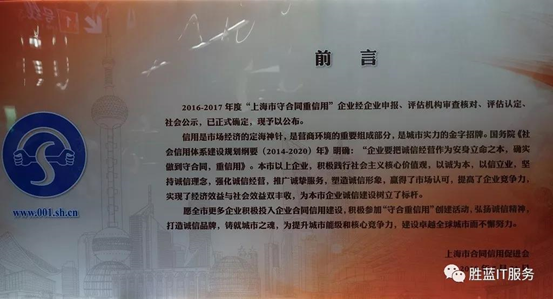 “上海市守合同重信用企业”认定活动由上海市工商行政管理局统一指导和监督、由上海市合同信用促进会统一组织和认定,自2003年启动开始,每两年 举办一次。从合同管理水平、合同履约能力、合同履约状况和企业合同社会 信誉度等四个方面对上海市各企业进行评定,是目前上海地区最权威的企业 诚信标准。
